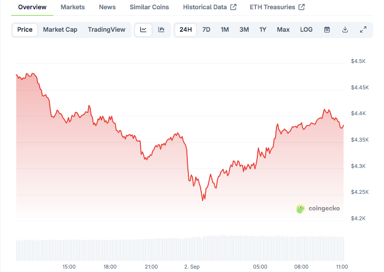 CoinGecko data shows Ethereum trading at $4,379.32, down 1.18% in 24 hours with $30.4B volume.