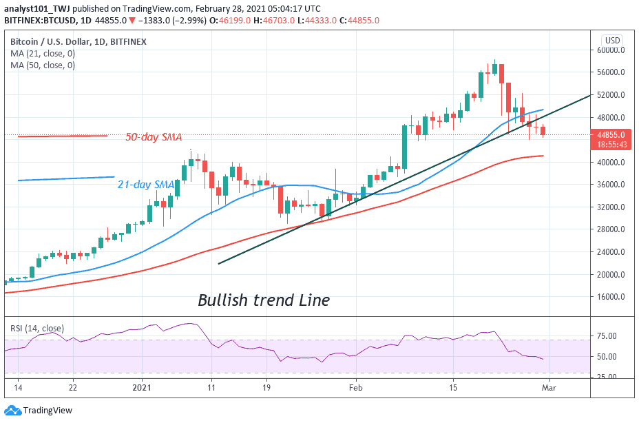 Since February 25, BTC/USD has been in a downward move. BTC price has fallen from the high of $58,000 to $44,000 low. Today, Bitcoin has been in a range-bound movement between $44,000 and $48,000.