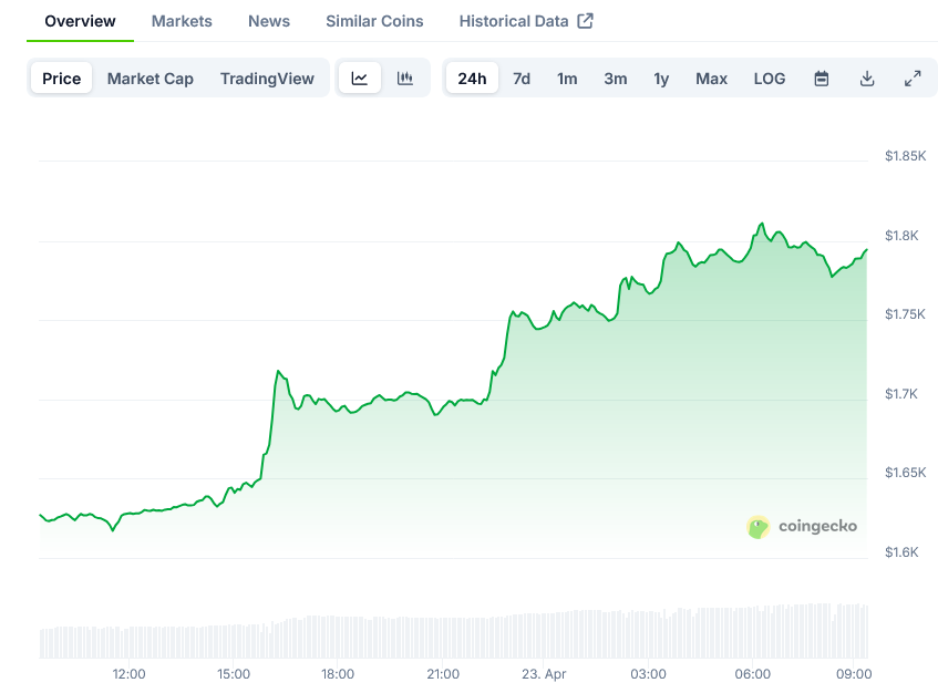 Traders are now focused on the $1,800 resistance zone. A clear move above this threshold could open the path for further gains toward $1,850 and possibly $1,920. The psychological $2,000 level, which Ethereum hasn’t reached since early March, is now back in view.