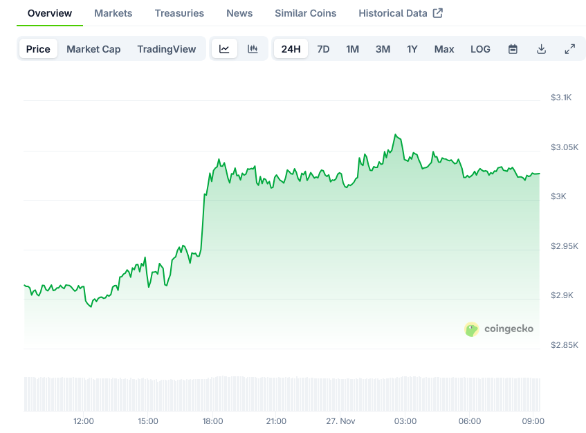Ethereum has climbed back above the $3,000 mark, trading at $3,037 as of November 27, 2025. The move represents a 3.5% daily gain for the world’s second-largest cryptocurrency.