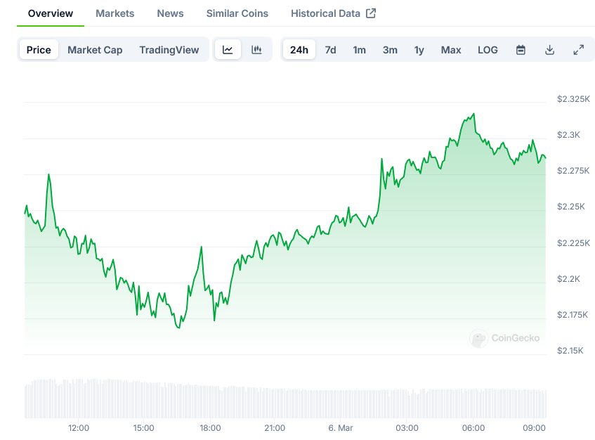 Ethereum (ETH) Price: Recovers Above $2,300 as DEX Volumes Drop 11%