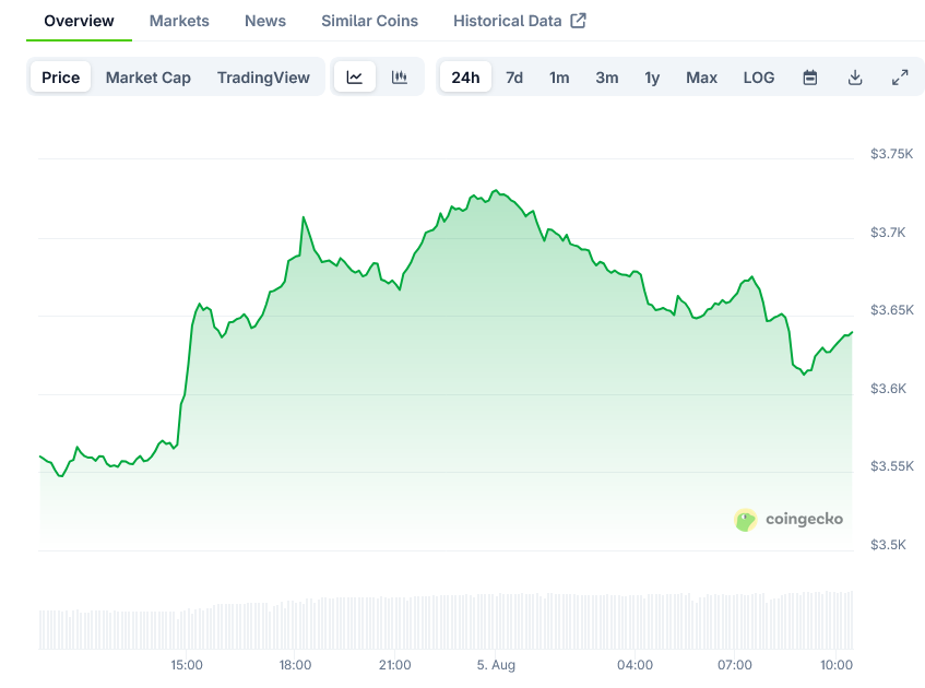 Ethereum has staged a strong recovery, jumping 5% to trade at $3,639 after testing critical support levels. The second-largest cryptocurrency by market cap is showing signs of renewed momentum after last week’s downturn.