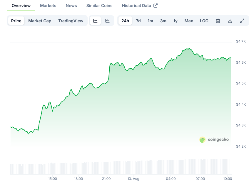 Ethereum (ETH) Price: Trading at $4,630, Just 5.35% Below All-Time High