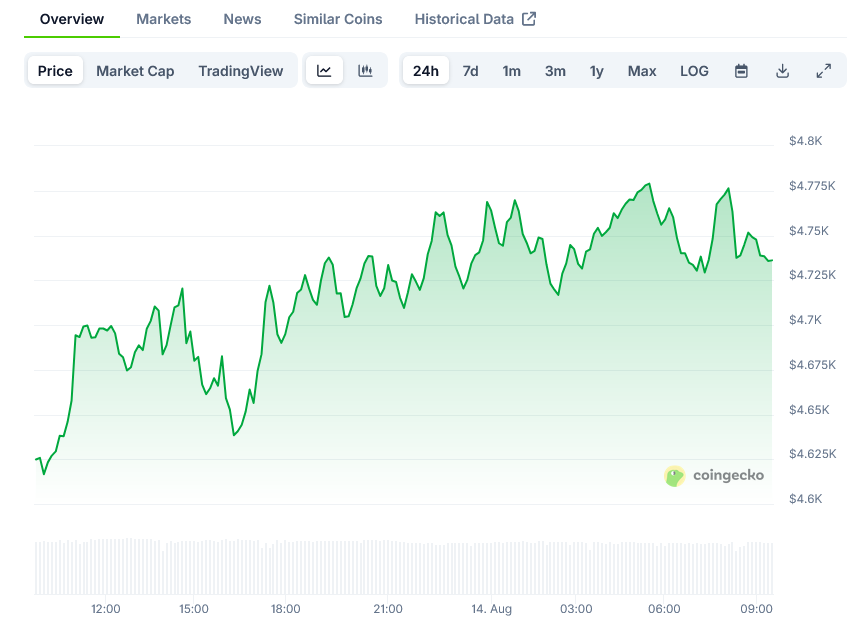 Ethereum’s price is surging toward new all-time highs, currently trading at around $4,700. This represents a gain of over 50% in the past month alone, making it one of the best-performing major cryptocurrencies.