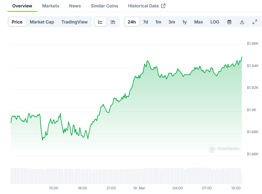 Ethereum is currently trading around $1,900 after falling from $2,000 to a low of $1,750 on March 11