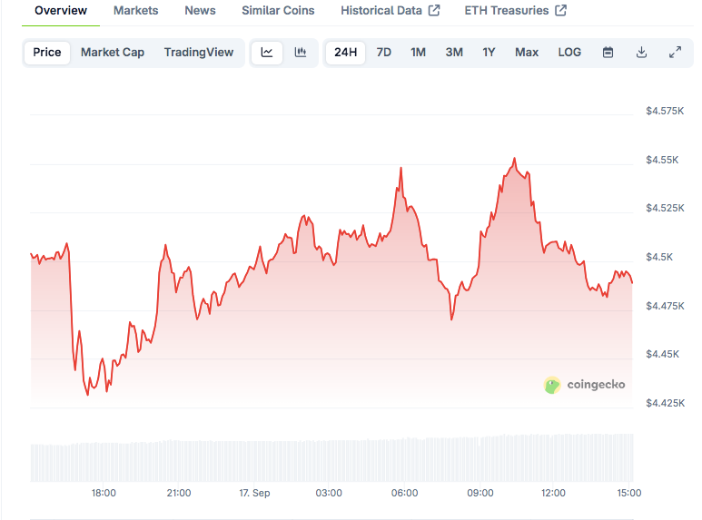 Per CoinGecko, Ethereum trades at $4,494.90, slightly down 0.17% in the last 24 hours but up 3.93% over the past week.