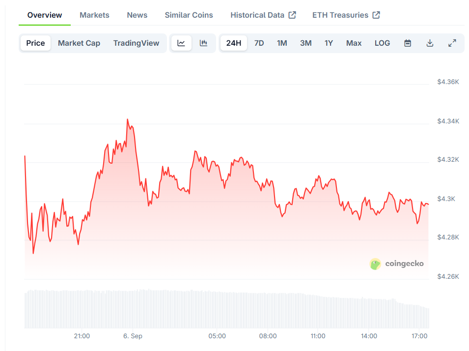 CoinGecko data shows Ethereum changing hands at $4,296.59 at press time, with trading volume over $21.8 billion in 24 hours. The coin slipped 2.39% over the day and 1.35% through the past week. The lack of momentum only deepens the pressure around support.